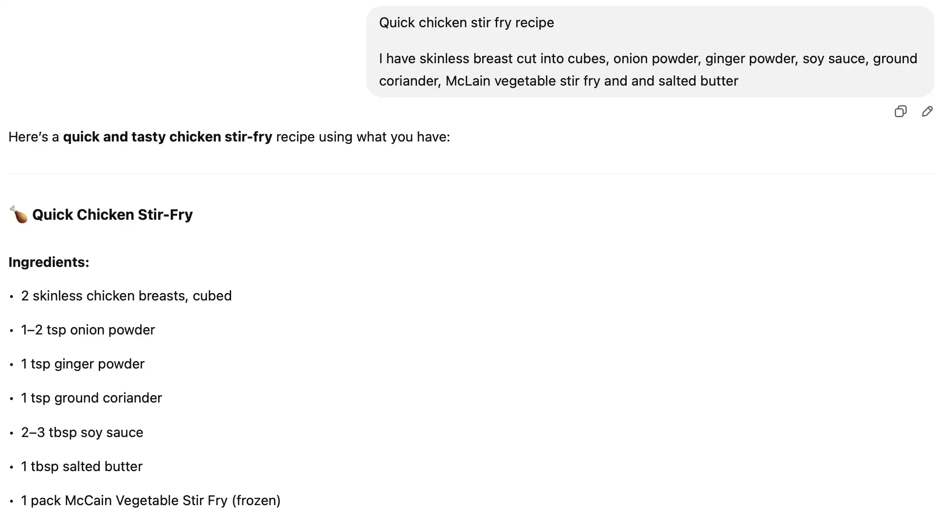 I opened a new tab, went to ChatGPT, and typed: ‘I have chicken, onion powder, ginger powder, soy sauce, ground coriander, and McCain vegetable stir fry mix. Give me a simple stir-fry recipe.